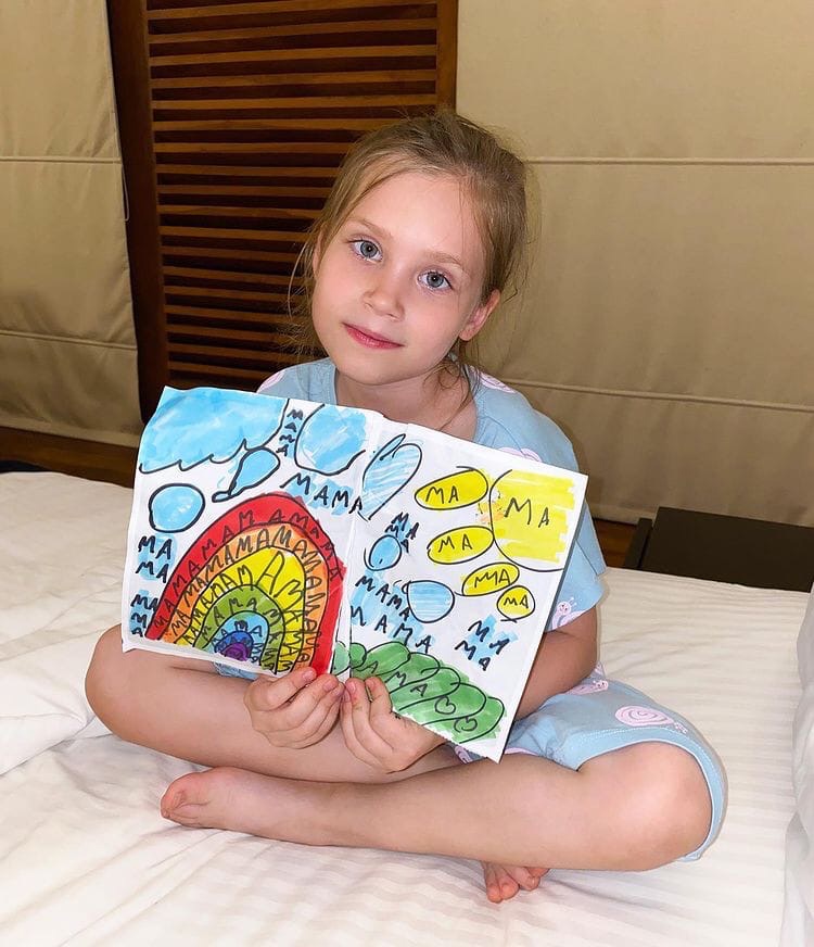 «Я была не рядом с дочкой и разговор был не громкий. Настя занималась своими делами и я была уверена, что она не слышит и особо не вникает. И она правда не слышала детали. Но очень чувствовала…», — рассказывает Асмус. Девочка решила поддержать маму и подарила рисунок, которым очень ее растрогала. Настя нарисовала радугу, небо, солнце, траву и везде написала слово «мама».