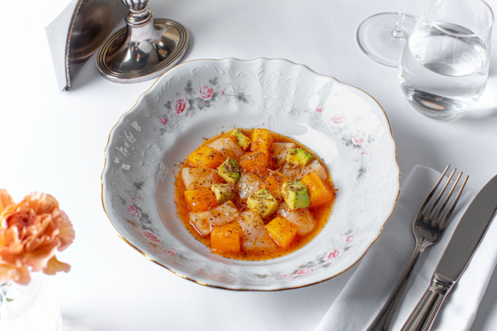 Огненно-рыжая хурма расставила акценты сразу в двух авторских хитах: крудо из гребешка с томатным понзу и желе на основе шампанского с мороженым из ряженки. Оба блюда стоит пробовать, пока фрукт на пике пользы и вкуса. Другая новинка раздела RAW: севиче из лосося в соусе из печеных перцев с арбузной редькой и томатами — еще одна пламенеющая закуска в цветах сезона.