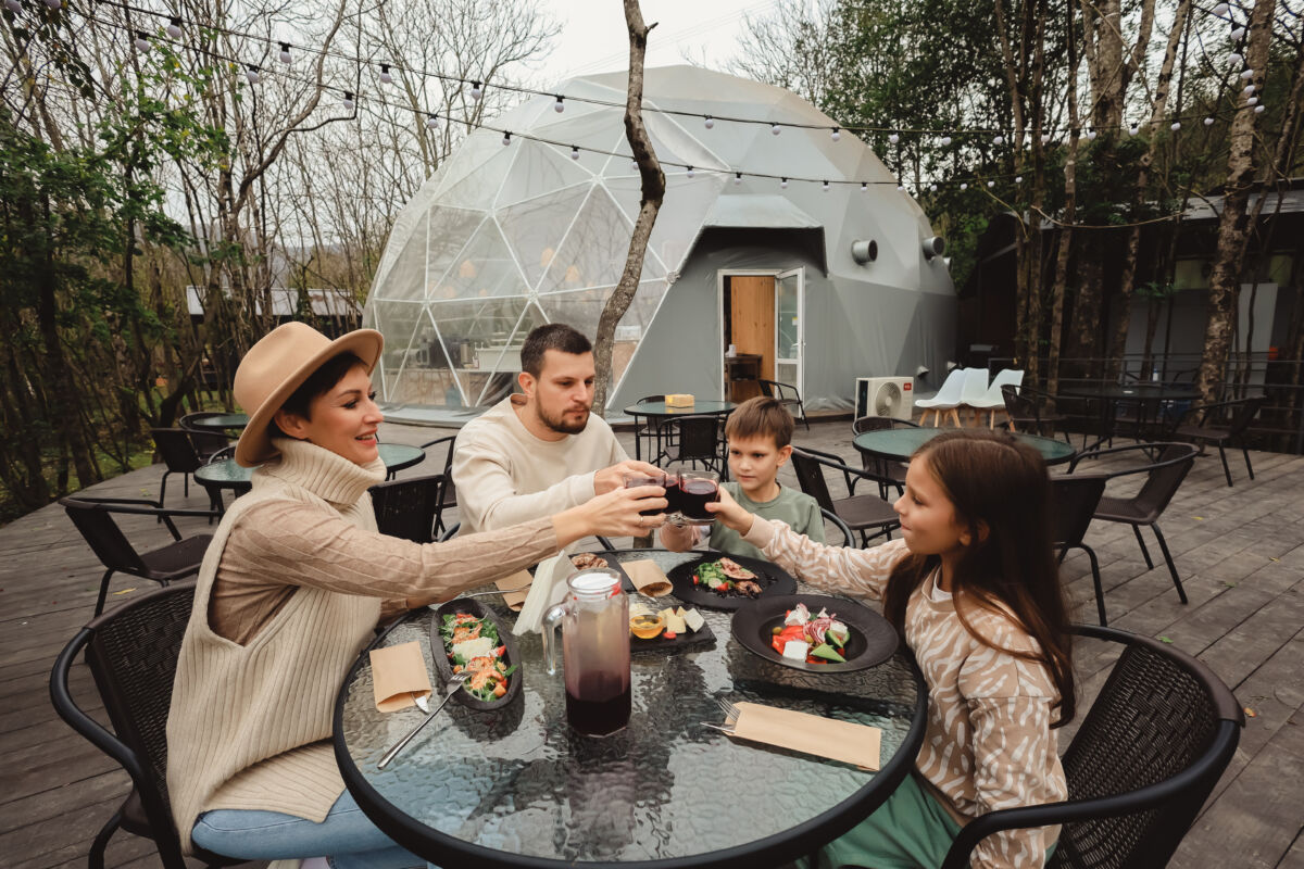 На кухне можно самим приготовить вкусный обед или ужин для семьи, а можно отправиться в ресторан, который расположен на территории в купольном сооружении. Завтраки, кстати, включены в стоимость проживания.
