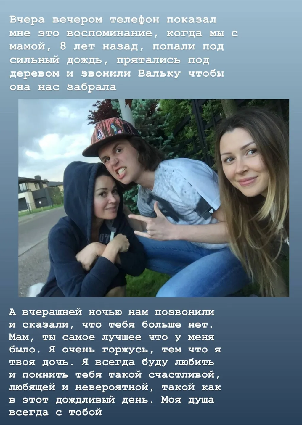 «Вчера вечером телефон показал мне это воспоминание, когда мы с мамой, 8 лет назад, попали под сильный дождь, прятались под деревом и звонили Вальку, чтобы она нас забрала. А вчерашней ночью нам позвонили и сказали, что тебя больше нет. Мам, ты самое лучшее, что у меня было. Я очень горжусь, тем что я твоя дочь. Я всегда буду любить и помнить тебя такой счастливой, любящей и невероятной, такой, как в этот дождливый день. Моя душа всегда с тобой», — написала Анна.