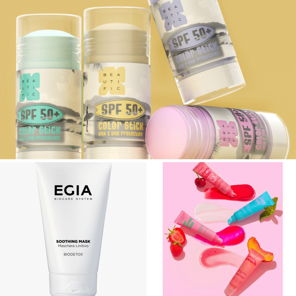 На фото представлены: Пенка для интимной гигиены Geltek; Увлажняющий крем для тела White Truffle Serum Body Cream d’Alba; Блески-бальзамы для губ MISS ORGANIC; Солнцезащитный двухфазный спрей Skeyndor; SPF-стики Beautific; Лак и мусс для волос hi, power LAGRASE; Несмываемый многофункциональный спрей MIRACLE CREATOR Matrix; скрабы для тела Natura Siberica; Ревитализирующая детокс-маска SOOTHING MASK / EGIA Biocare System.