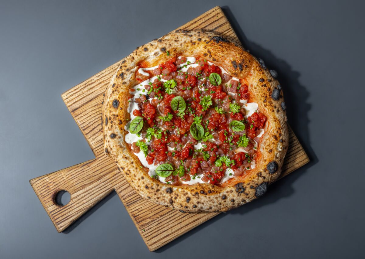 Егор создал пиццу на базе классических блюд: тартара из тунца в азиатской интерпретации и вителло тоннато. В составе пиццы: тунец, кунжутный дрессинг, лук сибулет, томатная сальса с мятой, соус тоннато, микрозелень и томатный соус (890₽).