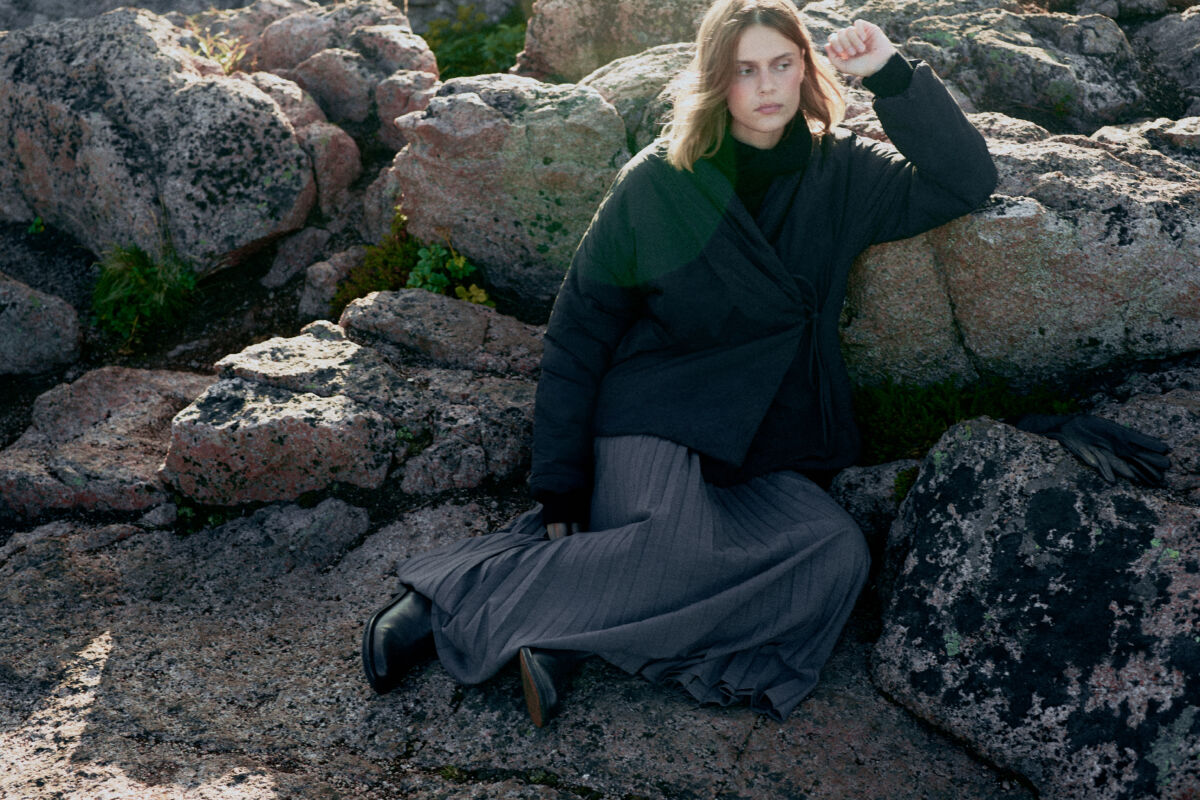 Также бренд поддерживает актуальный тренд на искусственные шубы, добавив в коллекцию модель с длинным ворсом в глубоком сером оттенке — мягкую, обволакивающую и при этом современную. Ее фактура словно повторяет игру северного прибоя — переливы, движение, живое дыхание ткани.
