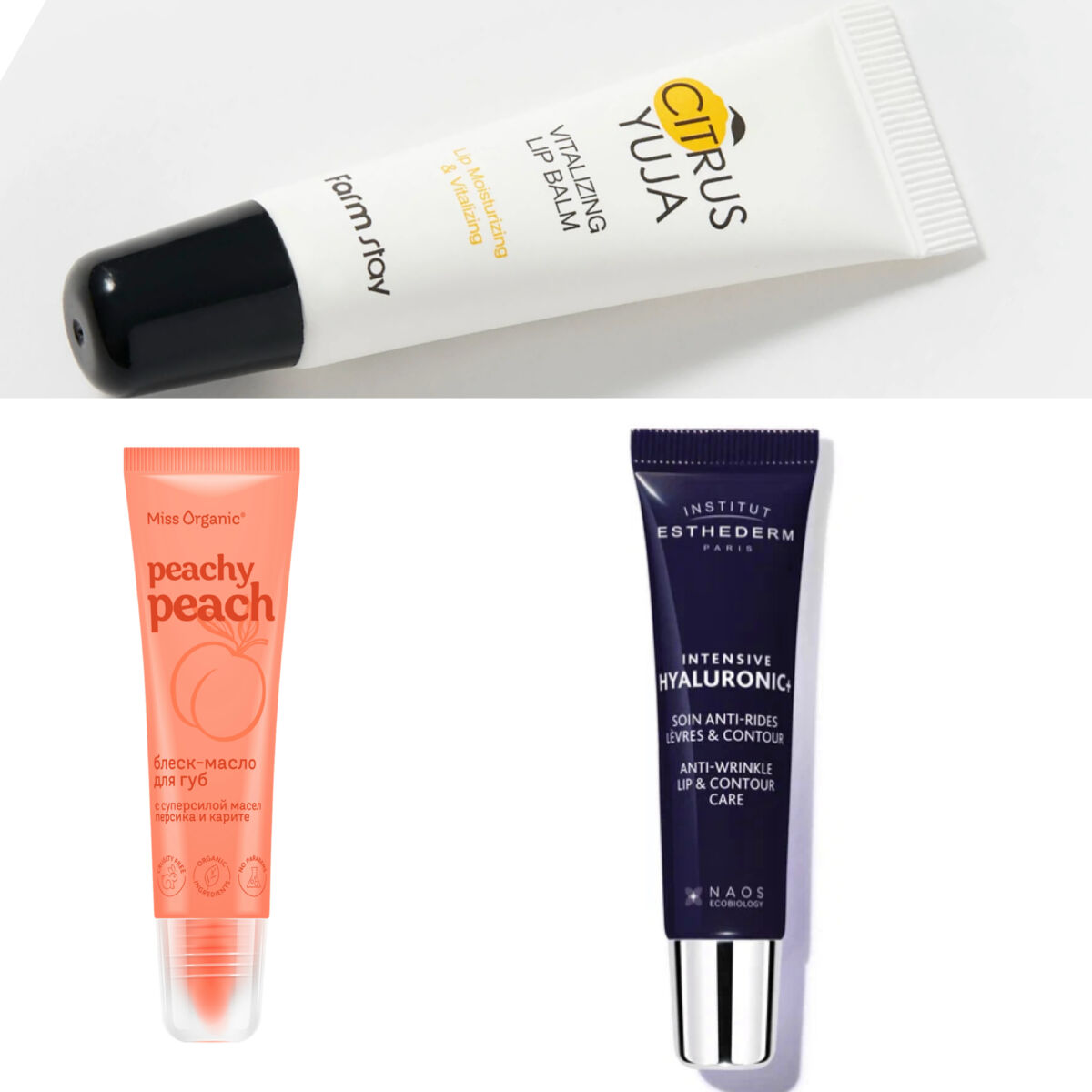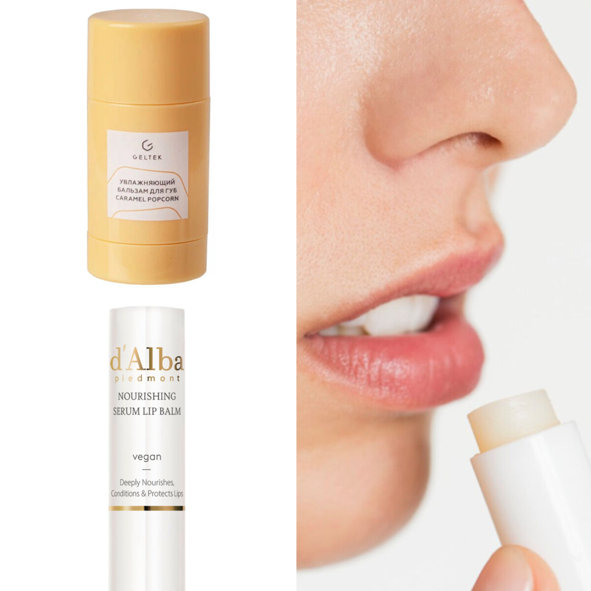 На фото представлены: Увлажняющий бальзам для губ Caramel Popcorn Geltek; d’Alba Питательный бальзам для губ White Truffle Nourishing Serum Lip Balm; Питательное блеск-масло для губ Peachy peach MISS ORGANIC; Бальзам-уход для губ Intensive Hyaluronic+.