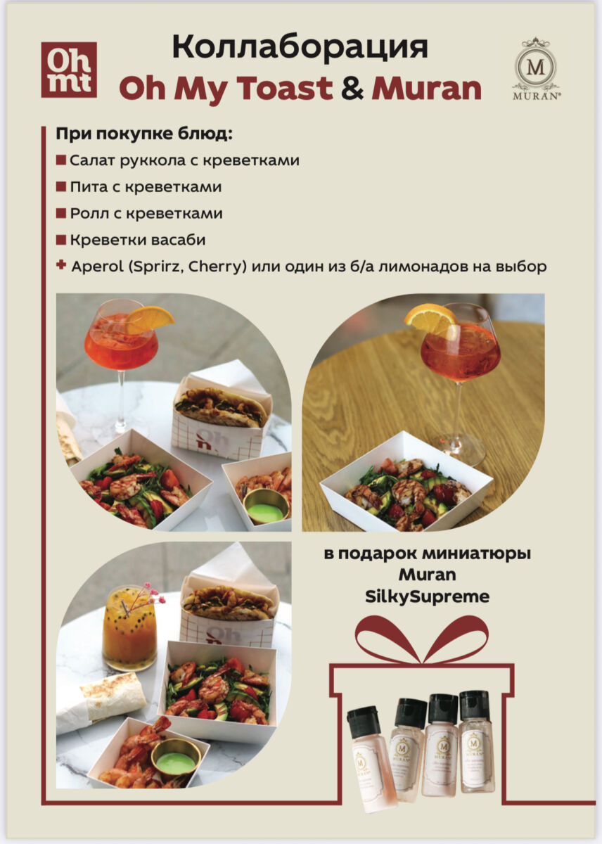 Бренд Muran родом из Италии, а потому в кафе гостям предлагают Mediterranean special c блюдами на выбор. При заказе одного из перечисленных — салата руккола с креветками, питы с креветками, ролла с креветками, креветок васаби и одного из напитков на выбор — Aperol (Spritz/Сherry) или лимонад гость получает в подарок реконструирующий шампунь и уплотняющую маску «Роза Провена» в travel-форматах.