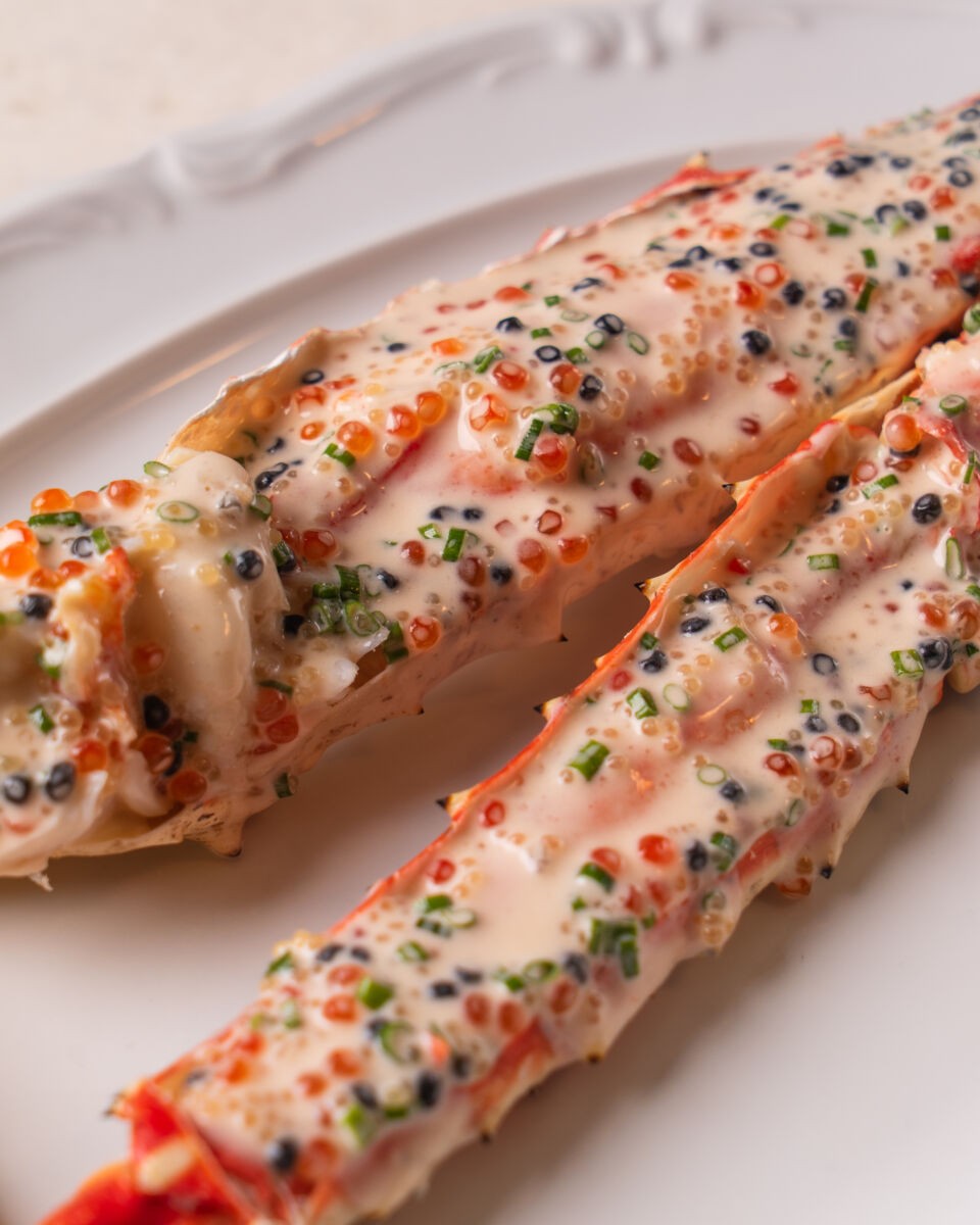 Это крупная, сочная клешня, подающаяся целиком — редкость для московских ресторанов. Её вкус подчёркивает густой икорный соус на основе красной икры, икры щуки и палтуса. Соус комплеменатрно подчеркивает вкус мяса краба.