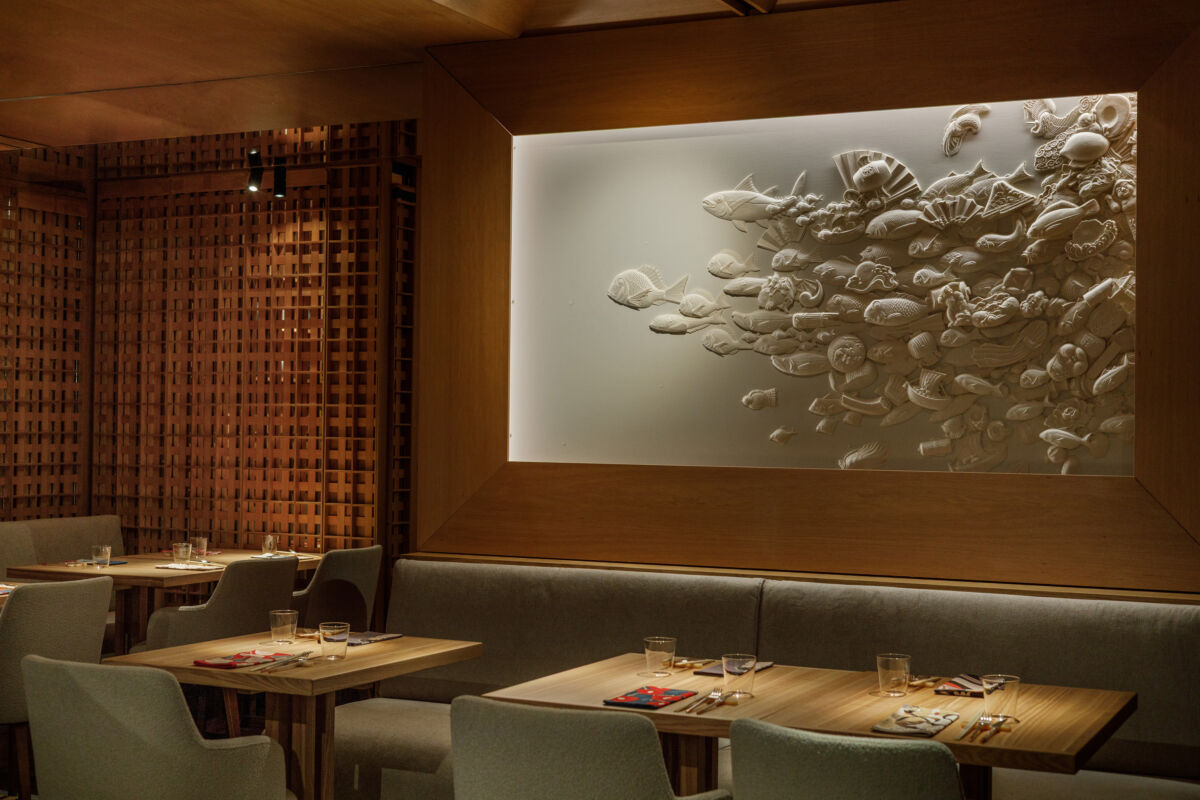 Получилось довольно современное пространство в светлых тонах, без всякого национального отсыла за исключением некоторых красивых деталей. Здесь много воздуха, матовые поверхности, натуральный камень и великолепные картины. Одна из них принадлежит перу Сергея Кузнецова с изображением знаменитого средневекового замка Мацумото, что находится под Токио, вторая, скорее панно из рисовой бумаги от Тетсуи Нагата, любимого художника Чизуко. Любопытно, что в ресторане есть еще несколько интересных мест — бар и нижнее пространство для омакасе ужинов с Led-экранами, где можно увидеть небоскребы того самого районе Токио Азабу.