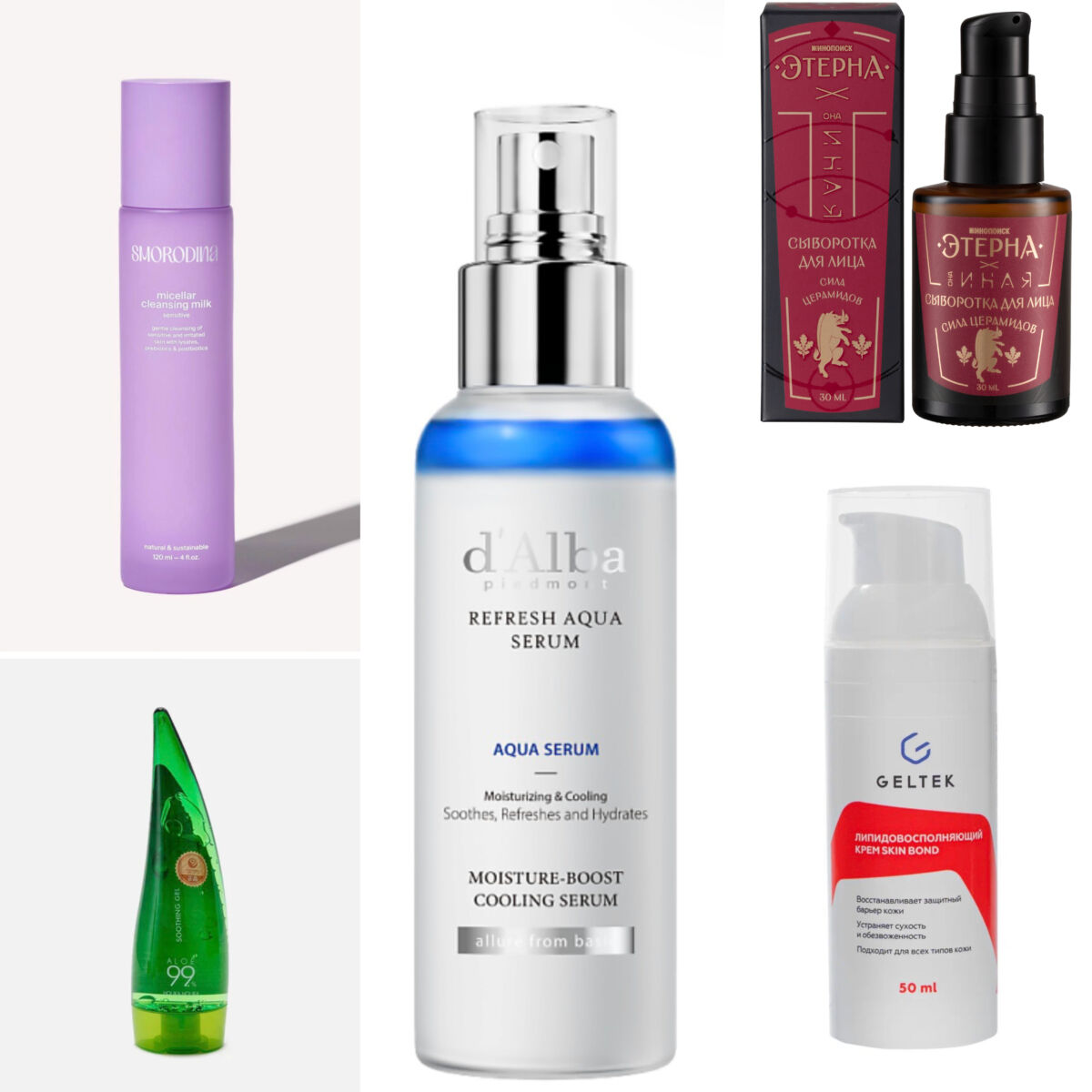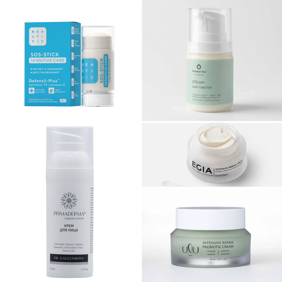 На фото: 10d RECOVERY KIT Sensilis, SMORODINA мицеллярное молочко для чувствительной кожи; Липидовосполняющий крем Skin Bond Geltek; Освежающая спрей-сыворотка для лица White Truffle Refresh Aqua Serum d’Alba; Сыворотка для лица сила церамидов защитная, «Она Иная х Этерна»; Био-коллагеновая маска для лица восстановление кожи SKIN RESTORATION, Space.latte YOUNG; Постинъекционный крем с ниосомальным троксерутином CREAM POST INJECTION, Booster Bar; Ультраувлажняющий и восстанавливающий крем INTENSIVE REPAIR PROBIOTIC CREAM, 50 ml, ULU; Увлажняющая Эмульсия Oil-Free от EGIA Biocare System; Крем для лица увлажняющий от PRIMADERMA; Holika Holika Универсальный несмываемый гель алоэ вера для лица и тела Aloe 99% Soothing Gel; Zeitun Face Mask Relief Miost Интенсивная увлажняющая маска для лица; ZEITUN Набор масок для лица саше Oriental Touch; BEAUTIFIC Успокаивающий SOS стик для сухой и чувствительной кожи атопичной кожи.